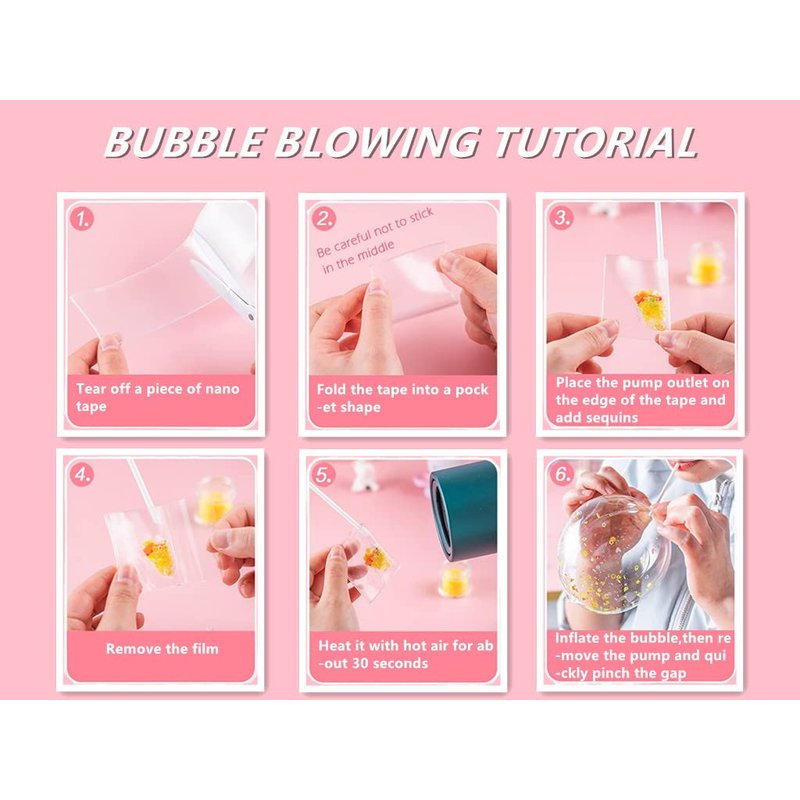 - Let’s DIY! You can use this nano tape bubble kit to DIY various shapes and styles of nano tape bubbles. For example, add some glitter, beads or water into the prepared “pocket” shape nano tape and blow it up to get a sparkling bubble ball; or show your painting talent on the finished bubble to make it more vivid.