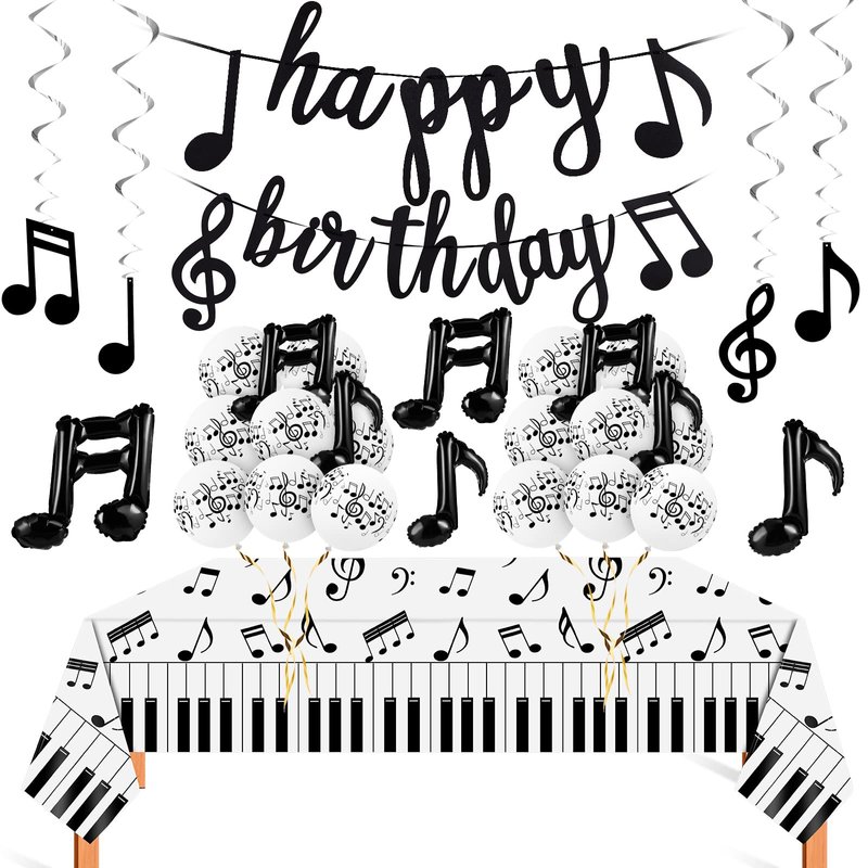 - Ideal combination: you will receive 21 pieces of latex music balloons (approx. 12 inches), 2 black single note foil balloons, 2 black double note foil balloons, 12 music note hanging swirls, 2 music note birthday banners and 1 disposable plastic musical notes table cover; Such an ideal combination can help you hold a memorable music themed party