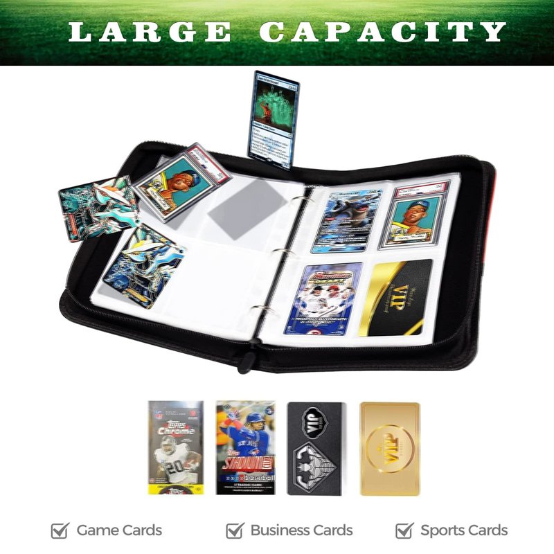 Football Cards Binder Each page has 4 pockets that hold cards on both sides and includes 50 high-quality removable sleeves that can hold up to 400 cards for trading card games. The three-loop design allows you to add or remove sleeves at will for all your collecting needs.The trading card binder is made of thick PU leather, Water or raindrops won’t seep through. the transparent card sleeves' main material is clear polypropylene, durable quality, Acid Free, waterproof, super sturdy that won't get cards to bend up, protect your card from fading and stain.The waterproof trading card sleeves keep better protection adopt reinforced heat-sealed seams technology. The quality zipper seals the binder so that the inner pages or cards do not fall. The extra wristband design makes it easy for both kids and adults to carry around.