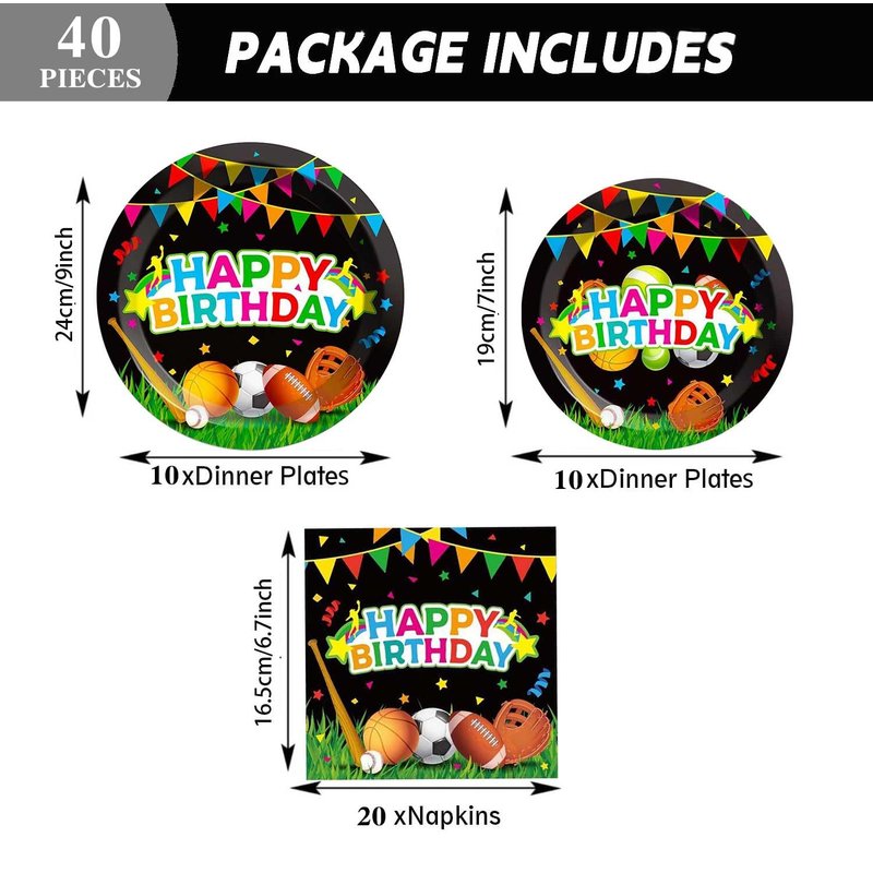 - sports party supplies:This sports theme birthday party supplies set includes 10pcs 9“plates, 10pcs 7“plates,20pcs napkins Serves 10 Guests.