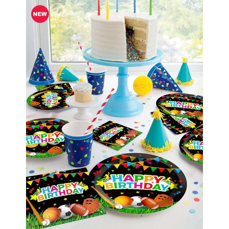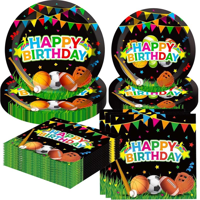 - sports theme party supplies set :This sports party plates and napkins is with baseball, football, soccer, basketball and other patterns print designs decoration , An attractive Boys Birthday Party atmosphere very suitable for a Birthday party. It can add vitality to the sports themed party or Boys Birthday Party , and leave unforgettable memories for the guests.