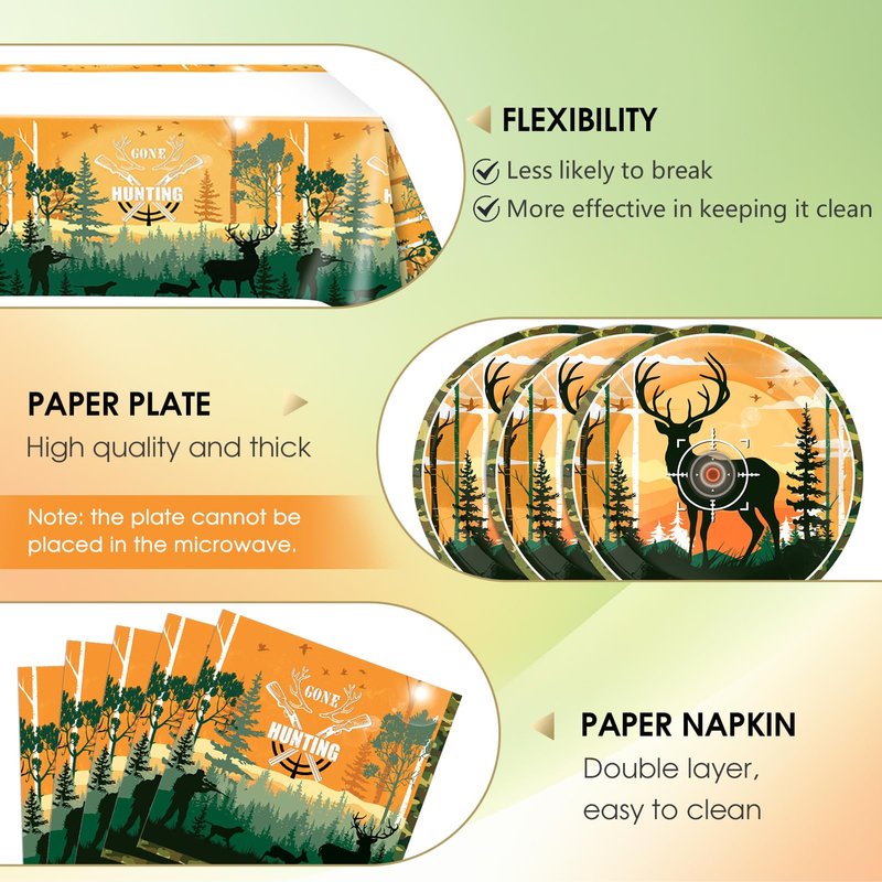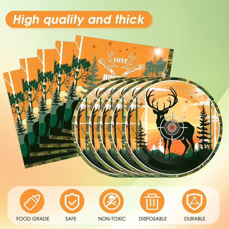 - Hunting Theme Element Design:Hunting theme birthday decorations are designed with cool camouflage hunting as inspiration and have a strong hunting style. Hunters, elk, and forests will provide your party with a real experience of outdoor hunting grounds.Hunting party decorations will make your party more enjoyable and fun.