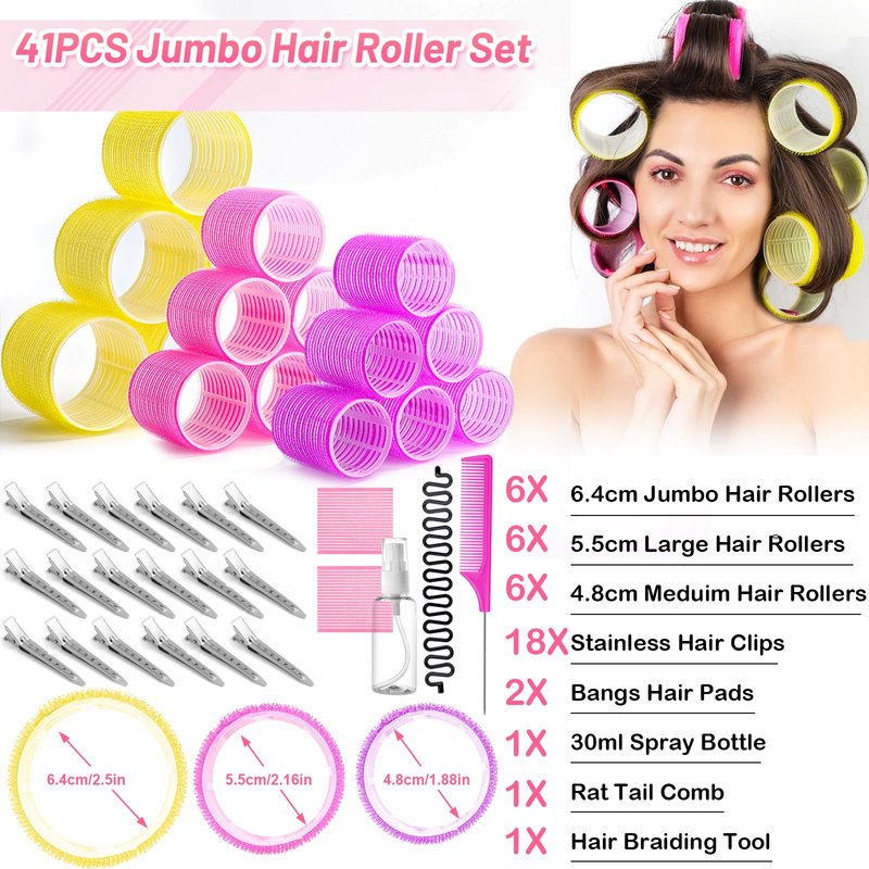 41 Pcs Jumbo Hair Curlers Rollers with Clips Big Hair Rollers with 3 Sizes 64mm 55mm 48mm, Self Grip Hair Roller for Long Medium Short Thick Thin Bangs Volume, Hair Roller with Comb Braid Tool