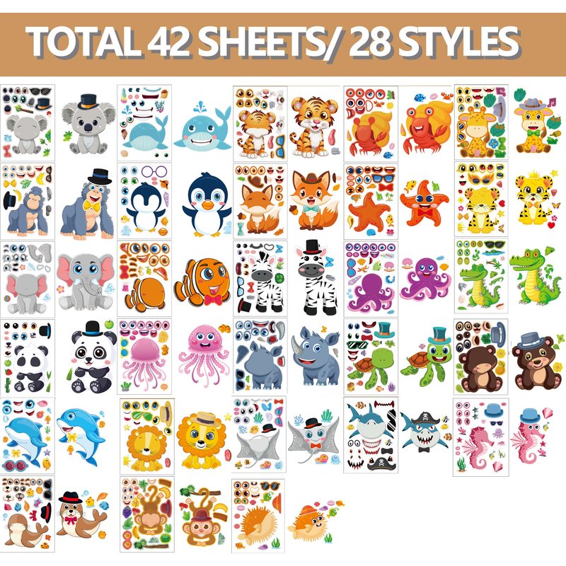 42 sheets Make Your Own Ocean&Safari Animals Stickers in 14 different styles. Great for kids to freely customize and create the face of fantasy ocean and safari animals. Enjoy creativity and fun to your party celebration for birthday and house Party, group activity, art class or other activities.