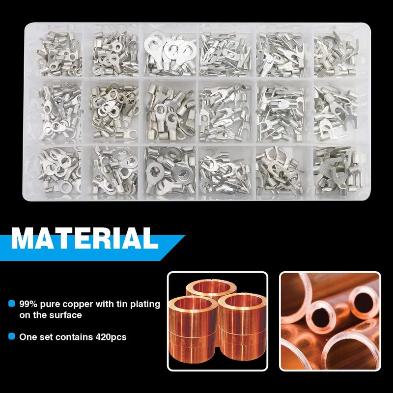 - Ring Terminal & Fork Connector Kit Material: T2(99.9% Purity) Copper.As a wire crimp connector, it has strong conductivity and is not easy to corrode
