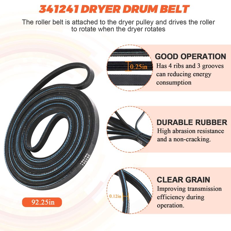 - ✅【VALUE PACKAGING】:4392065 Whirlpool drum roller kit Includes 1 x 691366 idler pulley, 1 x 341241 dryer drum belt( 92 1/4 inches in length, and 1/4 inch wide), 1 x 349241T dryer rear drum support roller kit( includes 2 x drum rollers, 4 x tri-rings, 2 x retaining washers). The 4392065 Dryer Repair Kit is made of strong plastic, rubber and stainless that prevent cracking and failure during installation and use, smooth surface, non-toxic and durable,not easy to break.