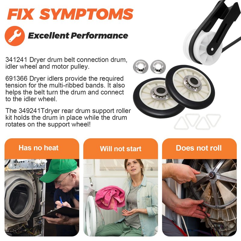 PRODUCT DESCRIPTION:Use this set of high-quality exact equivalent parts to fix any 29-inch capacity Whirlpool made dryer. Improve the durability of the dryer.