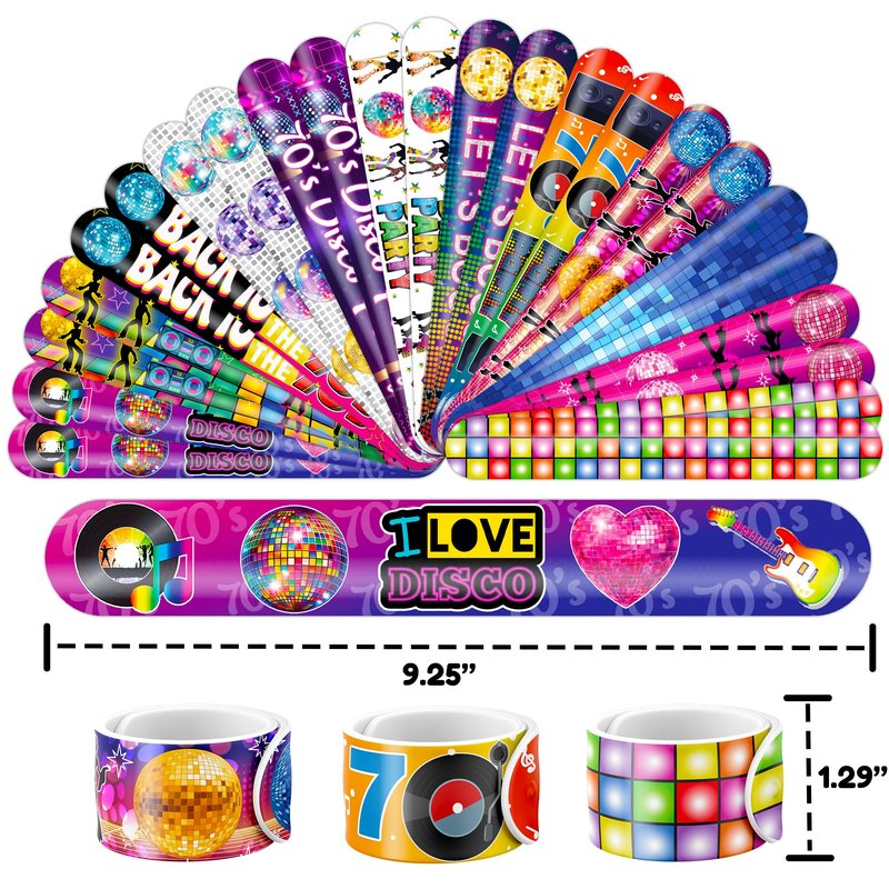 - š„³ćDELIGHTFUL 70s DISCO PARTY FAVORS BUNDLEć: Get ready for laughter with our set of 24 temporary tattoo stickers and 24 slap bracelets. Each piece showcases vibrant and adorable designs inspired by the 70s Disco theme. Perfect for both kids and adults, this bundle ensures endless fun. The bracelets measure 23.5cm x 3.3cm, providing a satisfying "slapping" experience as they effortlessly wrap around your wrist.
