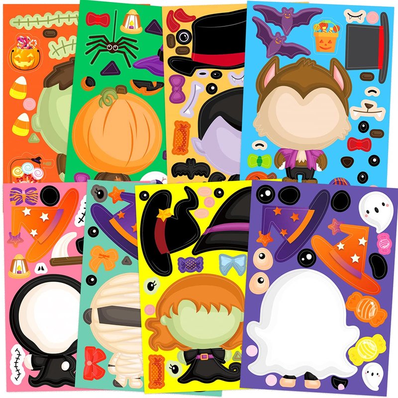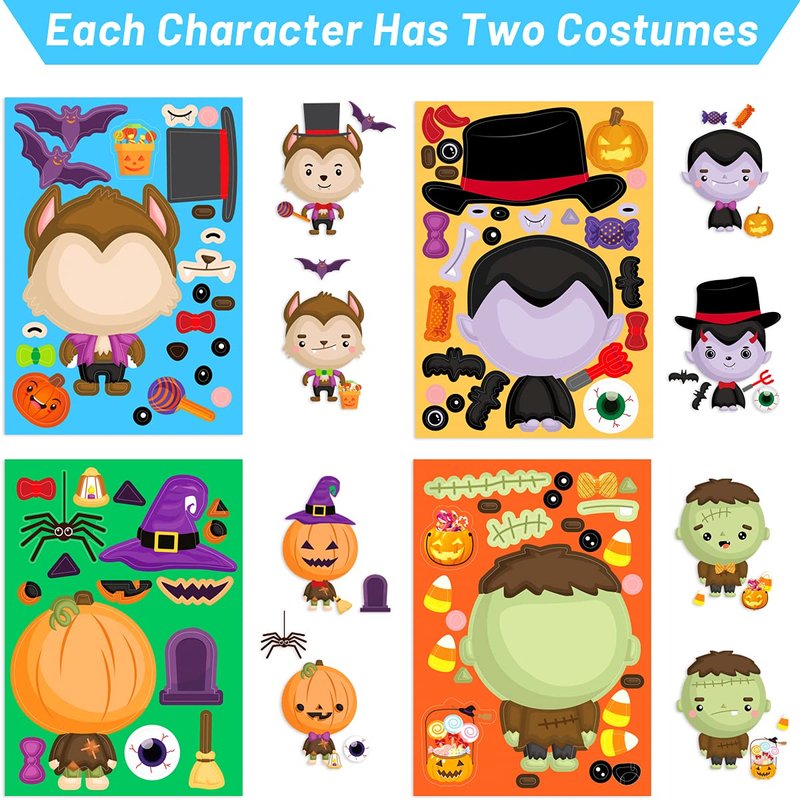 - What You Get : 48Pcs Make your own Halloween Character Stickers, size is 4.7x6.7 inch. 8 cute design, 6 pieces each pattern. Ideal for Halloween decoration