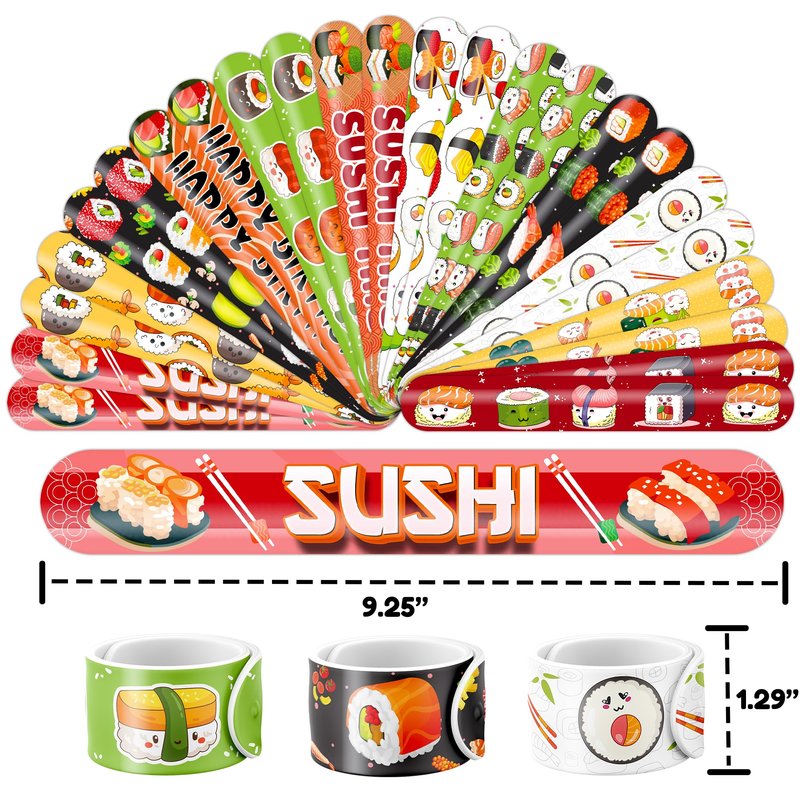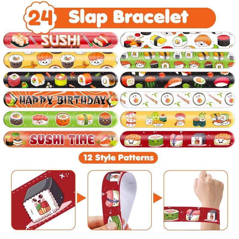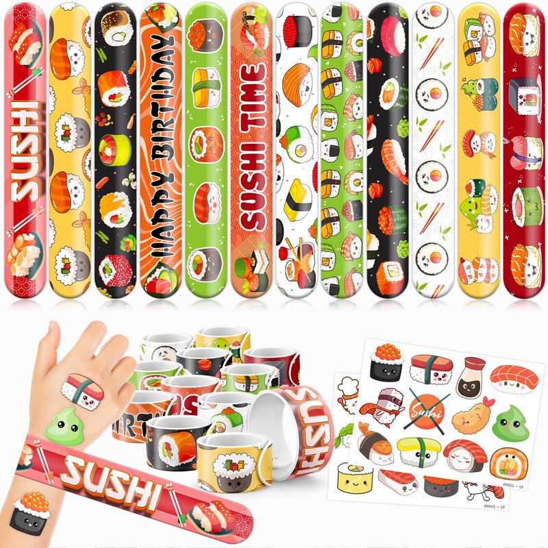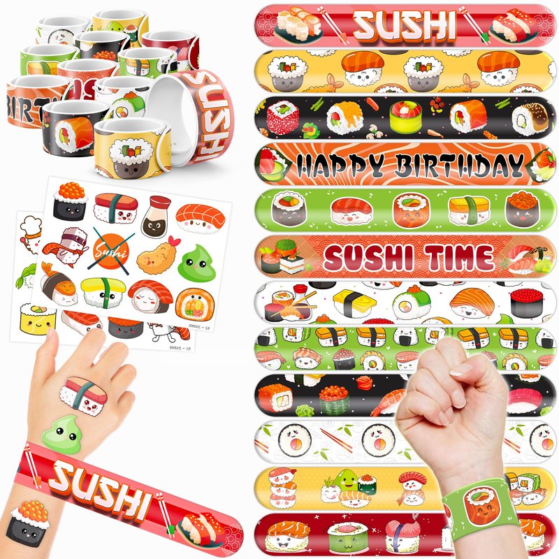 - šćPERFECT GIFT FOR SUSHI ENTHUSIASTSć: Our Sushi Temporary Tattoos and Slap Bracelets are the perfect gift for people of all ages, from kids to adults. Suitable for any occasion, they offer an affordable and delightful option. Whether for school events, birthdays, or stocking stuffers, this Sushi themed collection adds a fashionable and nostalgic element to anyone's accessory collection, invoking happiness and cherished memories.