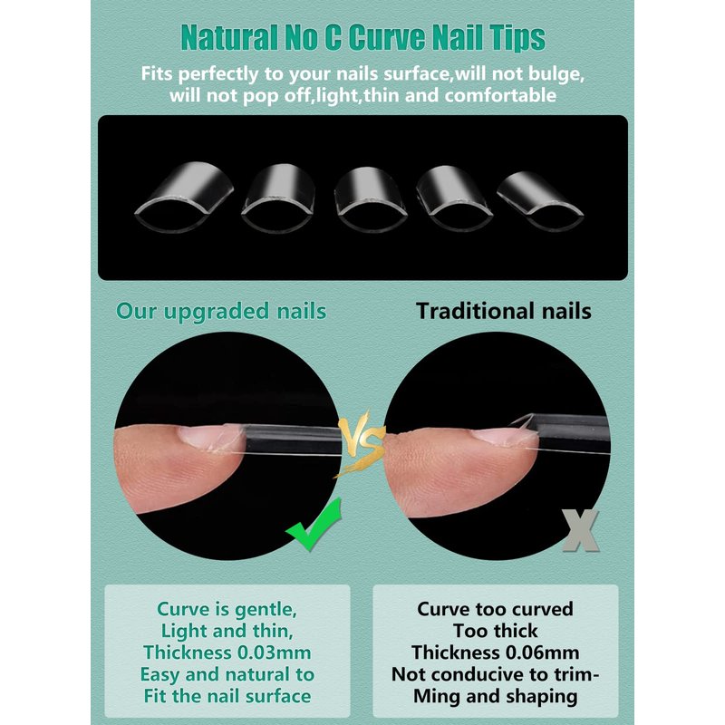 - High Quality ABS Material: Half cover no c curve nails are made with environmental friendly high quality ABS material, which is thick and sturdy enough to last about 2-3 weeks. What's more.it's no toxic, no smell, no harm to your nails, providing you a safe and comfortable nail doing experience