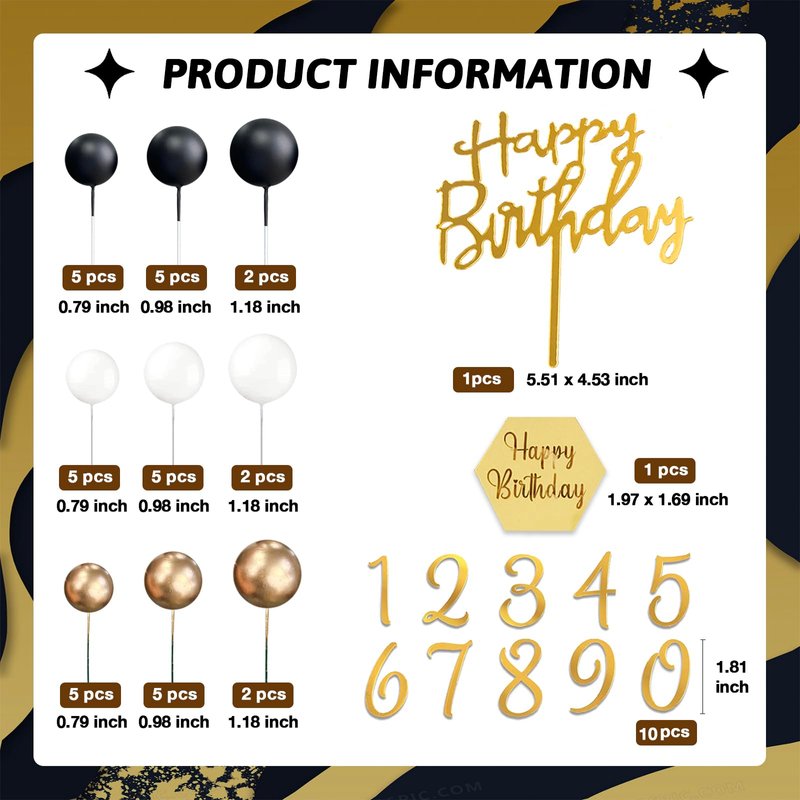 - 【Package】You will get 12 x black balls cake toppers, 12 x gold ball cake decorations and 12 x white ball cake toppers in different size, 2 x gold happy birthday cake cupcake toppers and gold acrylic numbers 0-9 cake topper decorations, very exquisite and super valuable.
