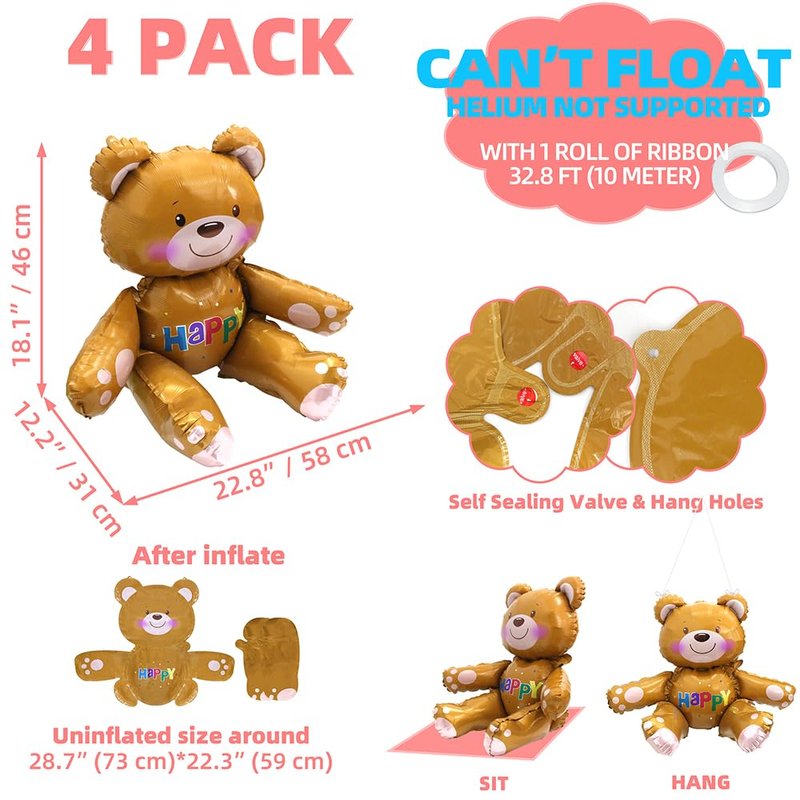 4 * 4D teddy bear animal balloons (brown bear foil mylar balloon), uninflated size is around 28.7'' (73 cm) width * 22.3'' (59 cm) tall (it is around 23'' when inflated, see picture for size).