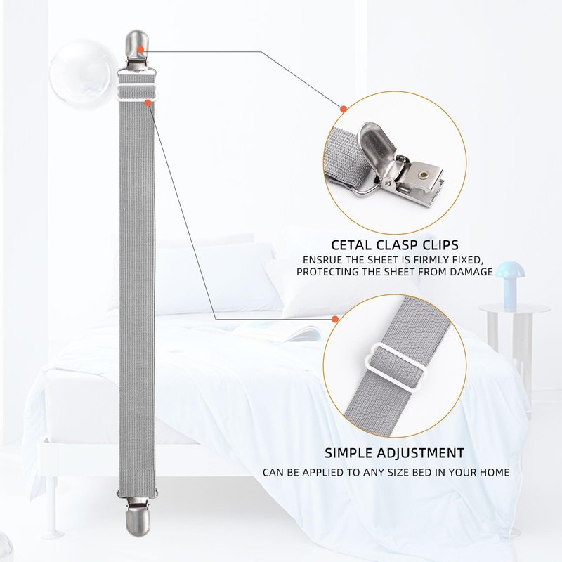 - DURABILITY & ADJUSTABLE - Our bed sheets straps comes with suspender clips on each end that attach securely to sheets, and is fully adjustable for any bed and sheet size. Great for keeping sheets in place to eliminate wrinkling and bunching. This way you can keep your sheets tidy all the day and enhance your sleeping experience, no more loose sheets in the middle of the night!