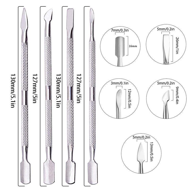 - Cuticle Nail Polish Peeler Scraper 4 pcs; Different shapes of cleaner heads to meet the needs of different parts