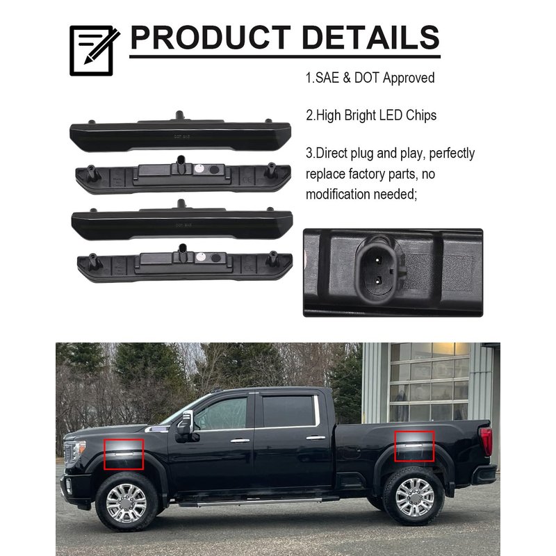 - 🔧【Easy Installation】: Plug and Play to install in just minutes, OEM Perfect fit and direct replacement. Simply remove original light and replace with the new housing light, connect the upgrade version lights plug into the factory socket and finish. No modification or trimming require. Upgrade design for your dual rear wheels well arch repeater side markers; Upgrade your Sierra with a new fashion cool style front and rear led side marker light and elevates your Truck's aura.