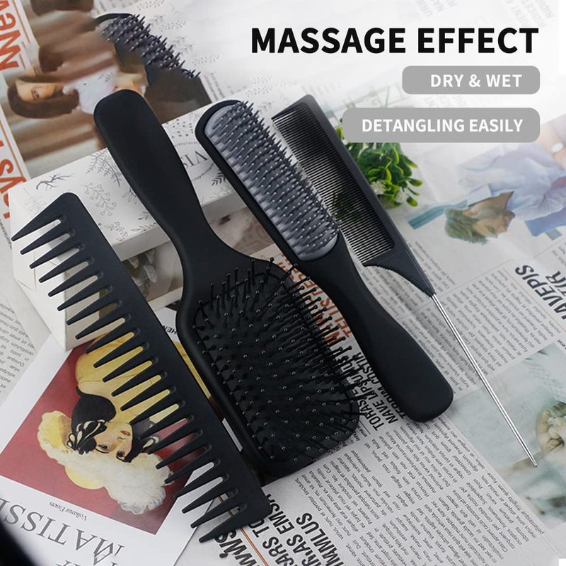 4Pcs Hair Brush Set, Included Paddle Brush Detangling Brush Hair Comb and Tail Comb, for Long Short Thick Thin Curly Hair Blowdrying Straightening Smoothing Massaging for Women, Men - Black