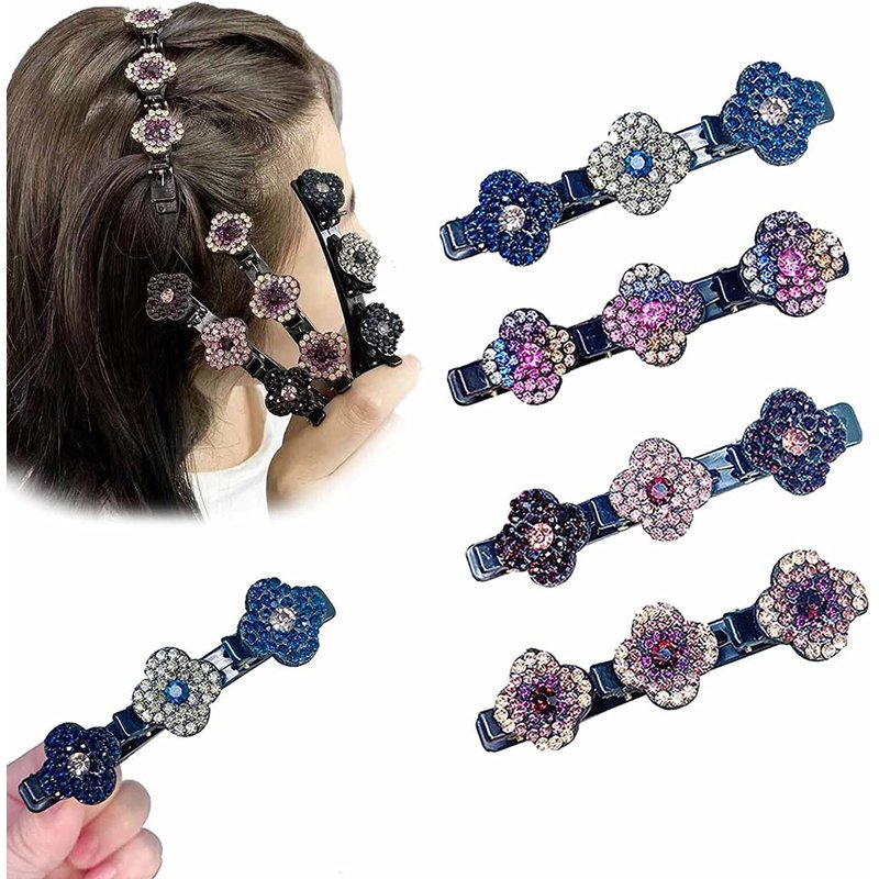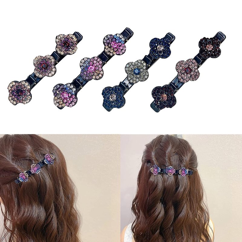 4PCS Satin Fabric Rhinestone Hair Bands, Four-Leaf Clover Fashion Double Layer Mini Hair Clip, Sparkling Crystal Stone Braided Hair Clips,Braided Hair Clip with Rhinestones for Women