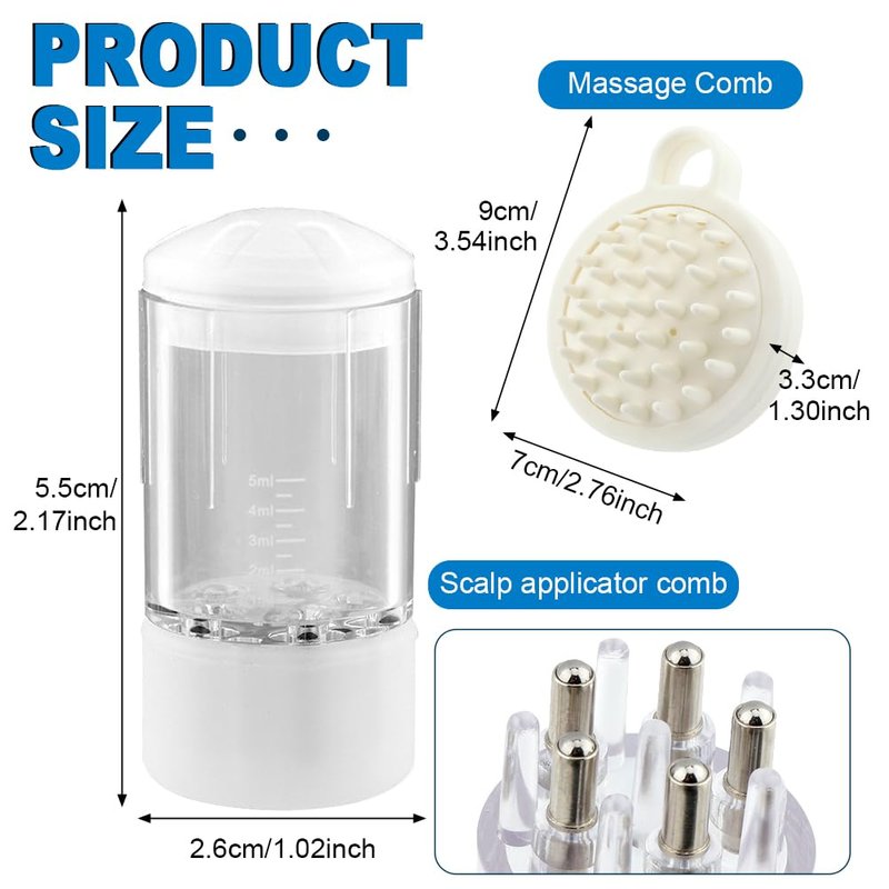 Size(approx.):scalp applicator comb(L x W)5.5 x 2.6cm/2.17 x 1.02inch, massage comb(L x W x H)9 x 7 x 3.3cm/3.54 x 2.76 x 1.30inch