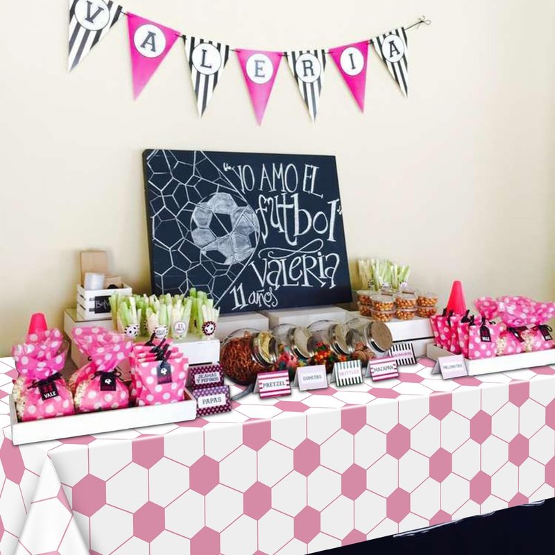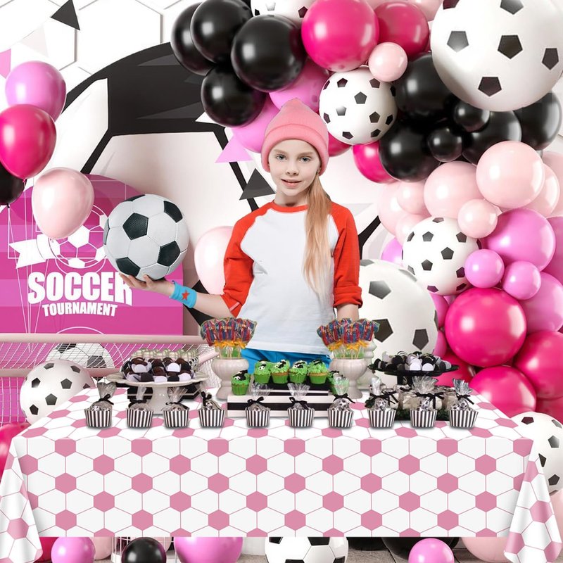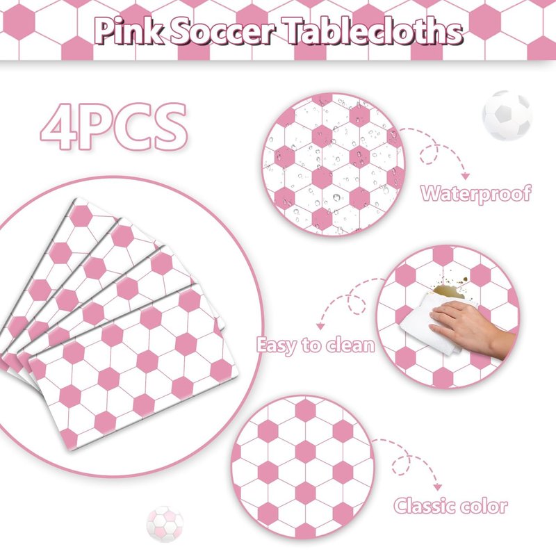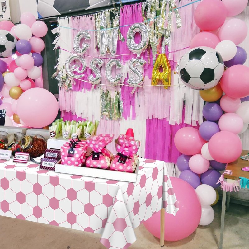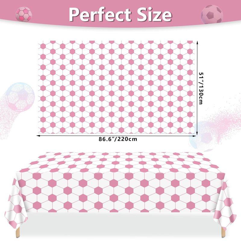 - Stylish Soccer Pattern Design: Our soccer tablecloths feature a charming pink and white color scheme of real footballs design as the background. This festive touch adds a sense of excitement and joy to your soccer-themed party, making it the perfect backdrop for fun-filled celebrations.