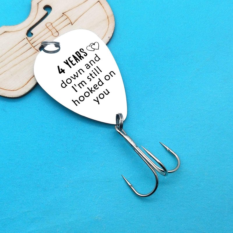 - 4 Year Anniversary Gifts for Him: “4 Years Down and I'm Still Hooked On You” This fishing hook will make lovely 4th Anniversary gifts for the fisherman in your life.Celebrate your time together and show your boyfriend/husband/fiance how much you care, This engraved fishing lure will make a memorable gift that will be treasured forever.
