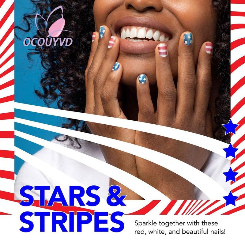 - Whether you're attending a BBQ, parade, or fireworks show, our press on nails will complete your Independence Day look with a touch of flair. Be the star of the party with our red, white, and blue nail designs.