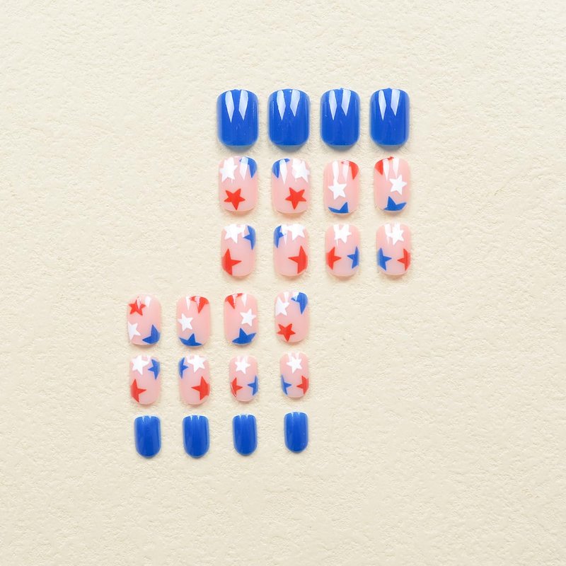 4th of July press on nails extra short square false nails with star designs.They made of high-quality glossy acrylic,it provides a durable and long-lasting choice for women daily nail decoration.These easy to apply nails can enhance your usual look,aiming to effortlessly and elegantly enhance your style.
