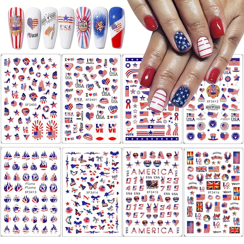 - Package Included: You will get 8 sheets of independence day nail stickers, including America flag, lips, heart, flame, stars, numbers, butterflies, etc. The size of each nail sticker is 3.9 x 3.1 inches