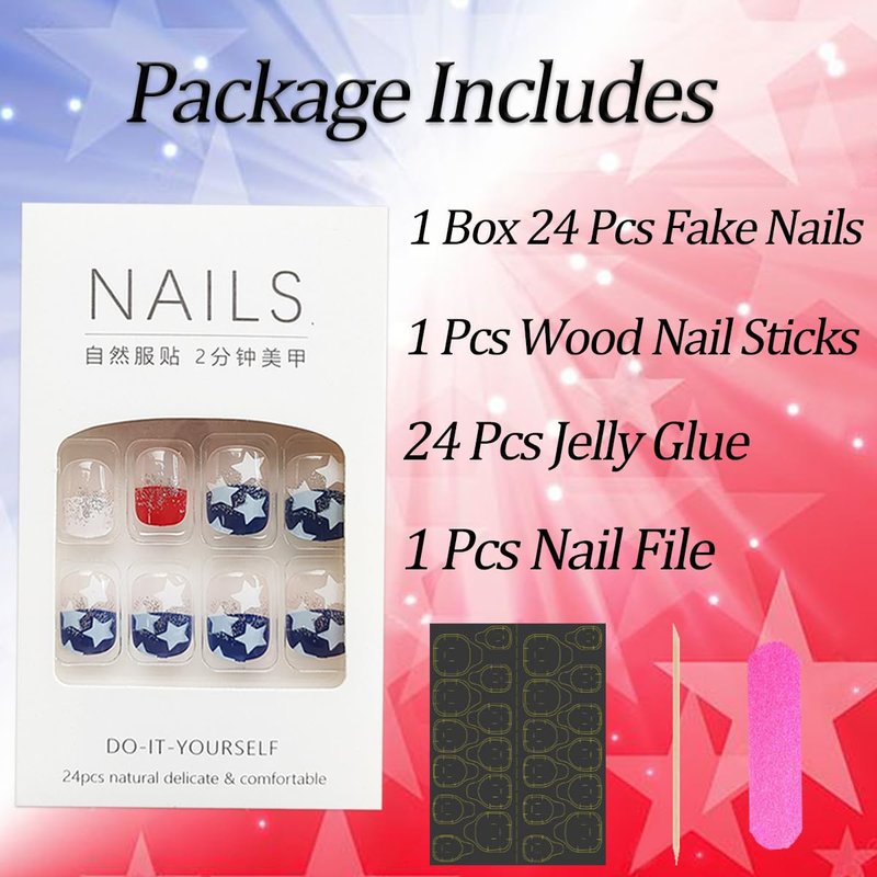 - Package Contains: You will get 24 pieces 4th of July fake nails in 12 sizes,1 piece nail file, 1 piece nail double-side stickers, 1pcs wooden stick for removing nails tips. Unique fashion design, make you more sweet and charming.