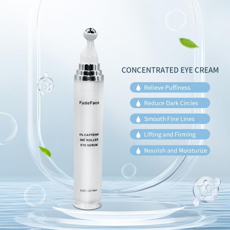 - Caffeine eye roller Diminish Dark Circles - FudeFace Eye Serum contains 5% caffeine, which is effective against dark circles caused by lack of sleep or staying up late. It is recommended to use it twice a day, eye serum for dark circles and puffiness.once in the morning and once at night.
