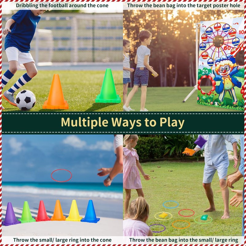 - Rich Outdoor Games: Our comprehensive carnival game set includes 6 Cones with LED Light, 6 Bean Bags with LED Light, 6 Big Toss Rings, 6 Small Toss Rings, 6 Colored Balls, 1 Clown Target Banner, 1 Storage Bag, the whole set is very convenient for storage