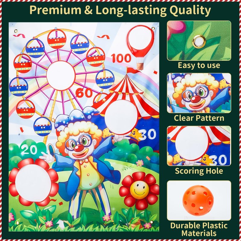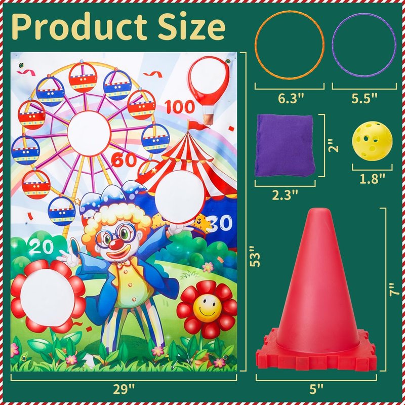 - Bean Bag Toss Game: Just hang up the clown target banner and tally the score by tossing the bean bags into the hole, the most wins. Or use a large or small toss ring to throw on the cone, the more in the cone wins! It can effectively exercise kids' arithmetic skills