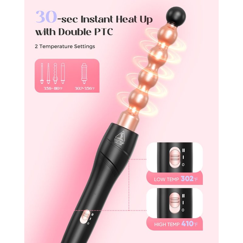 - 【30 Sec Quick Styling】: This 5 in 1 curling iron set made of double PTC & ceramic technology, so it can heat up in 30-sec for instant styling, saving 50% of time and effort, which helps to simplify the styling process for convenience and efficiency. Our hair curler offers two temperature options, allowing better control during styling to achieve optimal results while minimizing heat damage. Simplify the styling process for convenience and efficiency