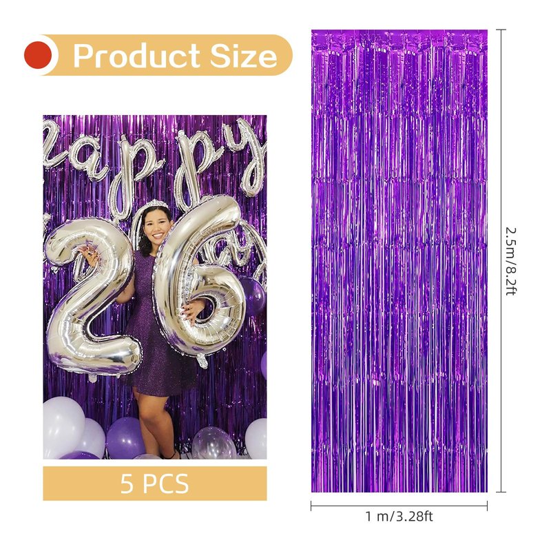 - {Perfect Size}: Set of 5, each pack curtain size is 3.2ft x 8.2ft (1m x 2.5m). The foil curtain is 8 feet long, the perfect length size covers a wide area, and can cover the entire area that needs to be modified. Which is great to use for indoor or outdoor perfect decoration to create a perfect decorative backdrop.