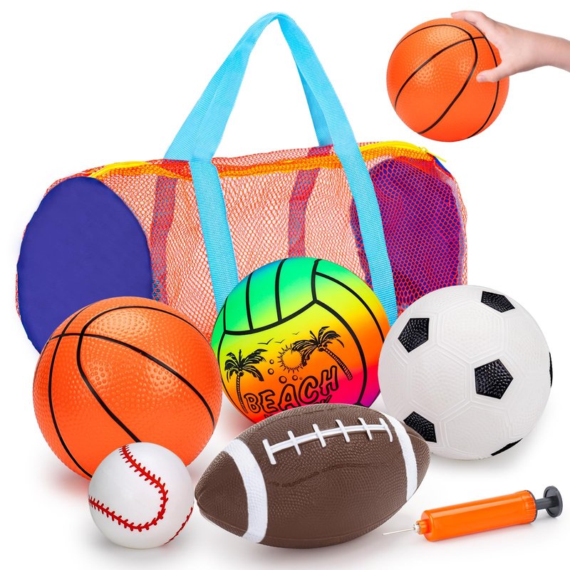 - 【SUPER VALUE SPORTS BALL SET】Our variety of sets include football, basketball, soccer, baseball and volleyball with storage bag and hand pump. The elastic ball bounce great, real and soft texture, suitable size, encourages toddlers age 1-3 to grip and explore easily, develops motor skills and coordination, ideal sports starter toys for 1 2 3 year old, helps children to recognize and learn different ball sports. Enjoy a variety of games without having to buy duplicate ball toys!