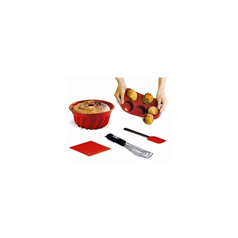 This 5 piece bake ware set includes everything you need for perfect results. Non-stick silicone surface provides quick and easy release. It also makes it very easy to clean. Not to mention, its dishwasher safe. You can use them up to 500 degrees and they are also great to use in your freezer. They won't crack or chip. Set includes bundt pan, 6 cup muffin pan, 1 hot pad, grip master and a spatula.