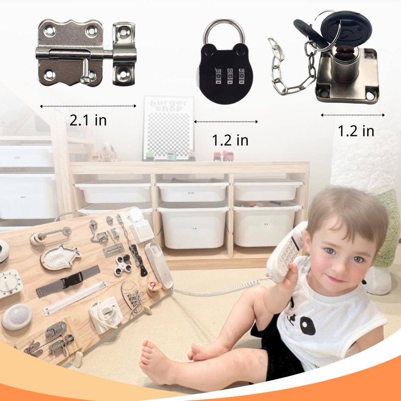 - Comprehensive Lock Set: Introducing our newest, most exciting lock series for your busy board! This all-in-one set features a variety of locks - a latch, chain lock, key lock, gate hook, and combination lock - giving your little ones a hands-on, real-life locking experience.
