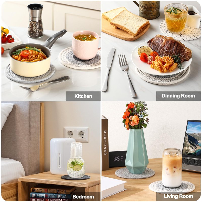 - PREMIUM QUALITY & SUPERIOR ABSORBENCY: Skillfully handcrafted from 100% natural cotton and fortified with robust cotton thread, these trivets boast exceptional durability. Their soft braided design ensures optimal moisture absorption and heat insulation, essential for every farmhouse kitchen and dining area.