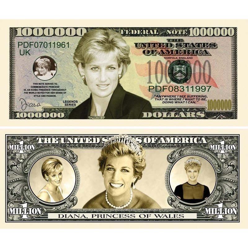 5 Princess Diana Million Dollar Bills with Bonus “Thanks a Million” Gift Card Set