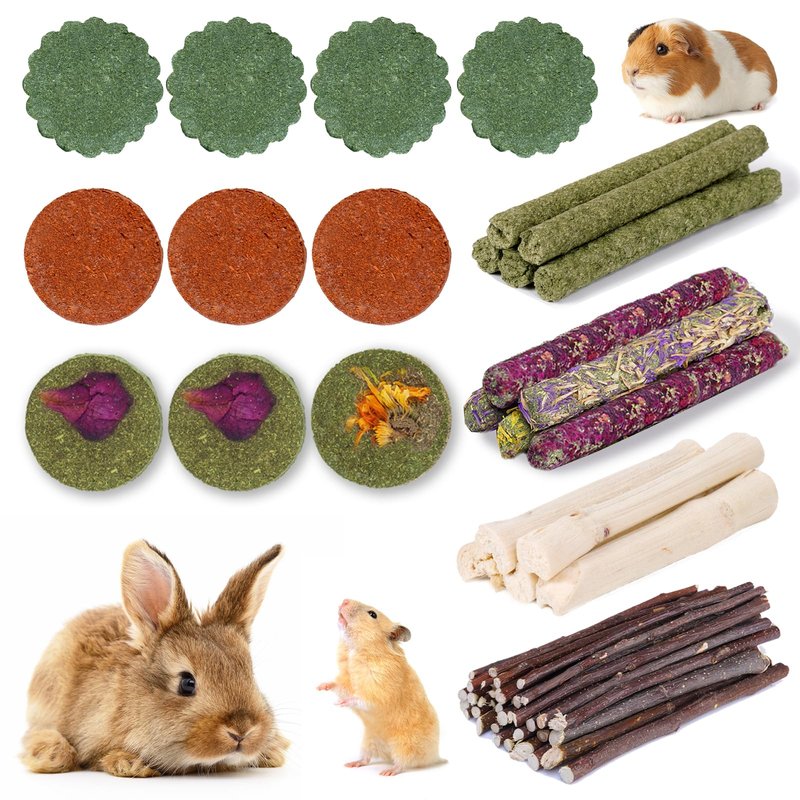- 【50-60 Pcs Rabbit Chew Toys】50-60 Pcs rabbit chew toys set includes 5*Sweet Bamboo, 5*Timothy Grass Sticks, 4*Timothy Grass Cookies, 3*Carrot Cookies, 5*Flower Sticks, 3*Flower Cookies, 100g*Apple Sticks.