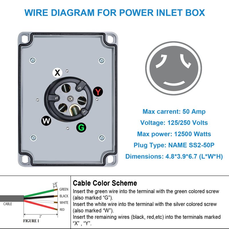 - Generator Power Inlet Box: GFORIT outdoor waterproof power inlet box is used for 50 Amp SS2-50P generator power cord. The specifications are 125/250 volts and the maximum power is 12,500 watts.The pb50 power inlet box is the best partner for outdoor generator accommodate generator cord, and perfect for backup power during a power outage.