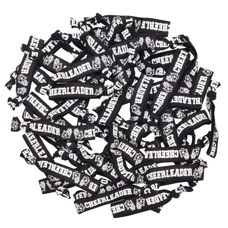 Award your team for accomplishments with this 50-pack of black cheerleader ponytail holders. The sturdy hair scrunchies can double as cheer bracelets for girls, boys, and coaches. The 4-inch bracelets feature "cheerleader" in a bold white letter with a megaphone and pom-pom design. Each cheer ribbon is made from polyester, so you can avoid pulling or damaging your hair during removal. This bulk pack is the perfect choice to show your spirit in and out of uniform.