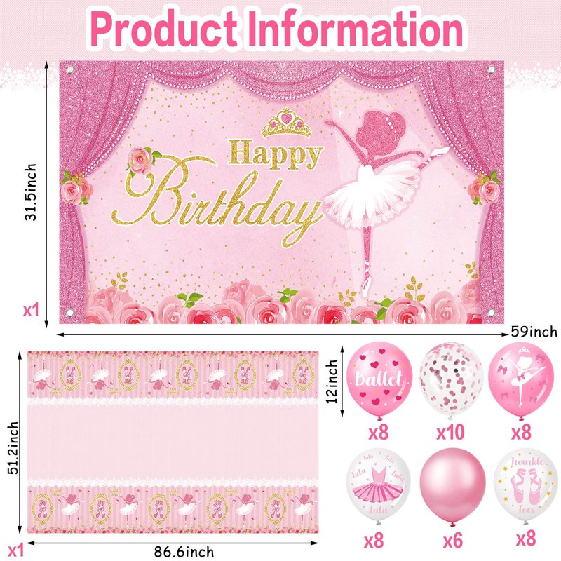 - Dimension Details: the princess theme baby shower decoration backdrop measures approx. 150 x 80 cm/ 59.06 x 31.5 inches, equipped with a 600 cm/ 236.22 inches long white rope, big enough for you to use, flexible and foldable; The ballerina balloons measure approx. 12 inches and the table cover measures approx. 130 x 220 cm/ 51.18 x 86.61 inches; Bright colors and right sizes will create eye catching visuals at parties