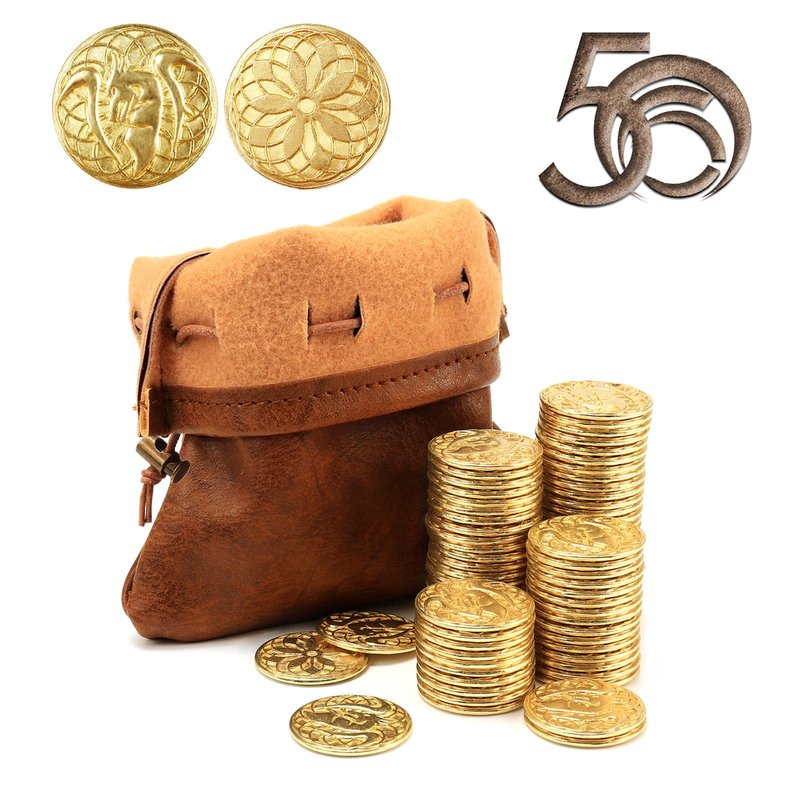 50 PCS Gold Coins & PU Leather Bag, DND Metal Coins, Fantasy Coins Treasure for Board Games, Fake Coins As Game Tokens for Dungeons & Dragons, Tabletop TTRPG Games Medieval Retro Accessories Addons