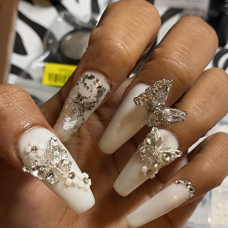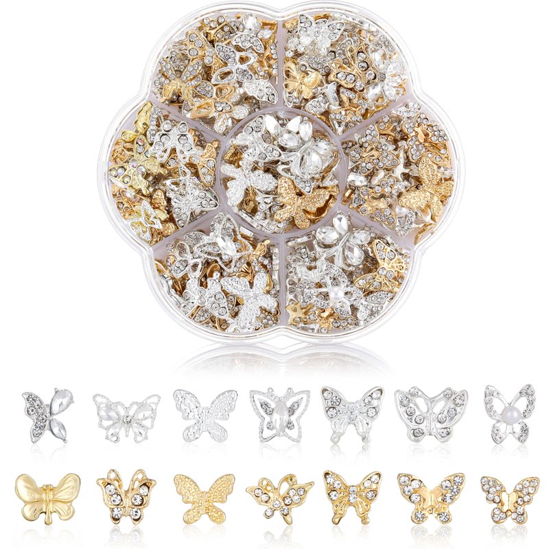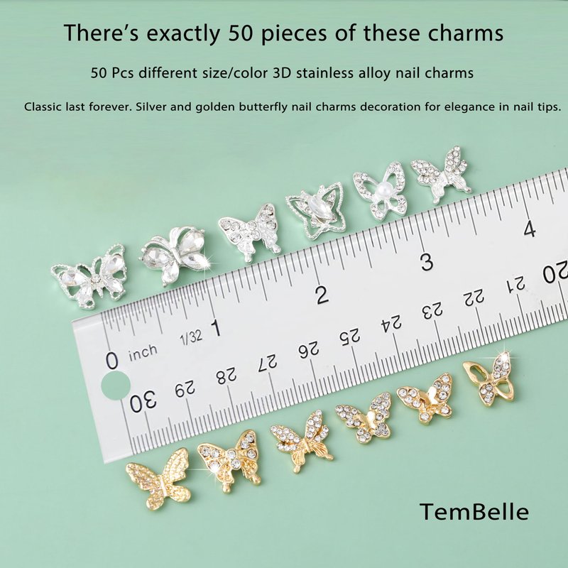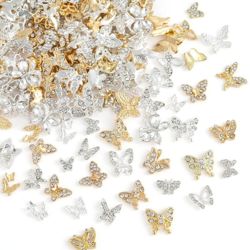 - High Quality Alloy - 3D Butterfly Bird Shape Nail Charms, made of high quality stainless steel alloy, 50 different styles Butterfly Nail Charms of gold and silver metal base with crystal diamond rhinestones, very sparkling and dazzling, make your nails full of charm.