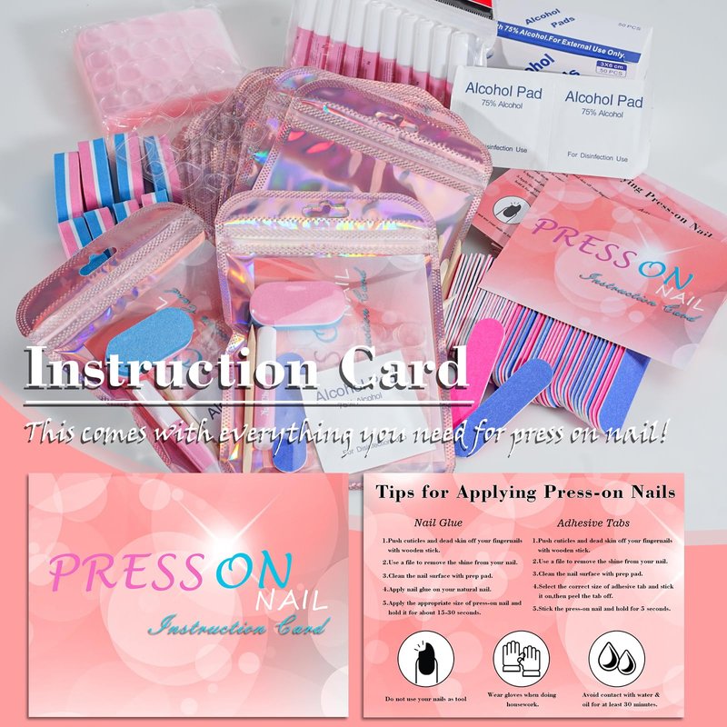 - 【Personalized Design 】This press on nail packaging set contains our self-designed instruction card, aimed at increasing customer satisfaction and goodwill. Each mini nail tool kit not only provides essential functionality but also features exquisite designs.