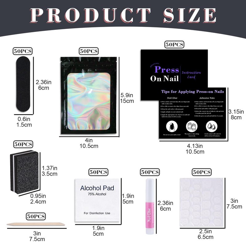 - 【Personalized Design 】This press on nail packaging set contains our self-designed instruction card, aimed at increasing customer satisfaction and goodwill. Each mini nail tool kit not only provides essential functionality but also features exquisite designs.