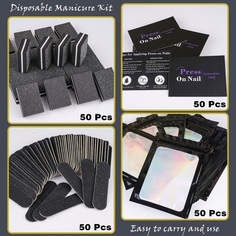 50 Set Disposable Nail Supplies Kits,Professional Manicure Press On Nail Tool Kit With Nail File ,Nail Buffer,Adhesive Tabs,Nail Glue,Sticks, Prep Pads,Bags,Instruction Cards for Nail Business(Black)