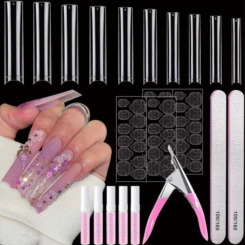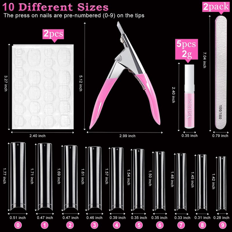 - PACKAGE INCLUDES: 500pcs no c curved square nail tips, 5pcs nail glues, 2pcs nail adhesive tabs, 1pc acrylic nail clipper, 2pcs nail files. Perfect nail kit include a number of essentials for you, which make it a breeze to finesse all ten fingers to your heart's content.
