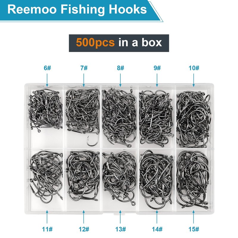 500PCS Premium Fishing Hooks, 10 Sizes Reemoo Carbon Steel Fishing Hooks W/Portable Plastic Box, Strong Sharp Fish Hook with Barbs for Freshwater/Seawater